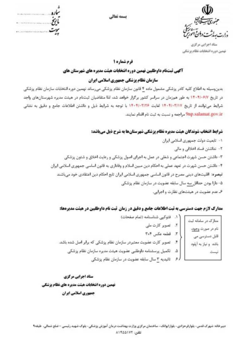 آگهی ثبت نام داوطلبین نهمین دوره انتخابات سازمان نظام پزشکی جمهوری اسلامی ایران