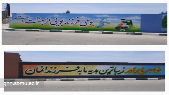 دیوار نویسی تبلیغاتی با شعارهای فرزندآوری بر دیوار آرامستان امام زاده ابراهیم مرکز خدمات جامع سلامت روستایی ولی آباد