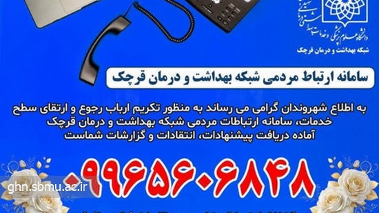 به اطلاع شهروندان گرامی می رساندبه منظور تکریم ارباب رجوع و ارتقاء سطح خدمات ، سامانه ارتباط مردمی شبکه بهداشت و درمان قرچک آماده دریافت پیشنهادات ، انتقادات و نظارات شماست .